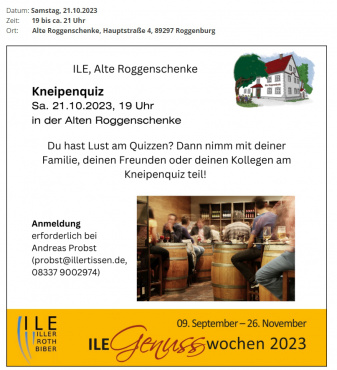 Besucht uns am Samstag, den 21.10.2023 zum KneipenQuiz im Gasthaus Alte Roggenschenke. Organisiert von der ILE Iller-Roth-Biber gilt es viele spannende und interessante Fragen mit Eurem Team zu beantworten!
